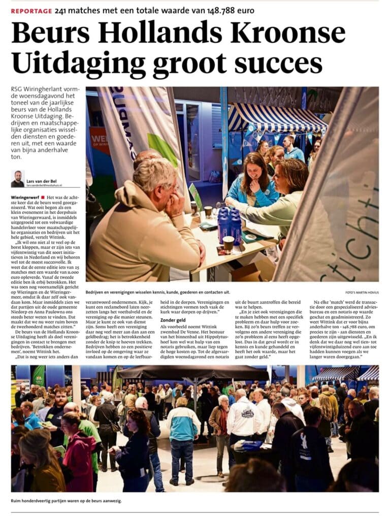 WIERINGERWERF – De beursvloer van de Hollands Kroonse Uitdaging is opnieuw een groot succes geworden. Op woensdag 11 maart kwamen