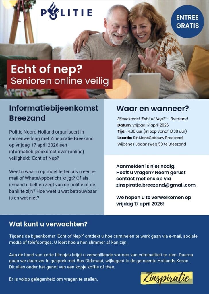 BREEZAND – Zinspiratie organiseert op vrijdagmiddag 17 april, in samenwerking met Politie Noord-Holland, een informatieve en toegankelijke bijeenkomst over online veiligheid. De middag vindt plaats in het SintJansGebouw in Breezand en staat in het teken van het herkennen en voorkomen van online oplichting.