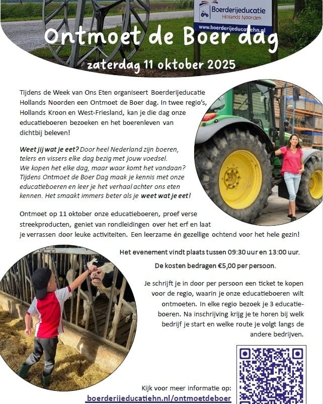 HOLLANDS KROON – Tijdens de Week van ons Eten houdt Boerderijeducatie Hollands Noorden op zaterdag 11 oktober een Ontmoet de Boer dag. Lees alles hierover op bijgaande flyer.