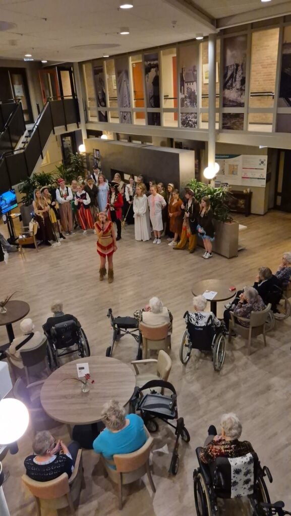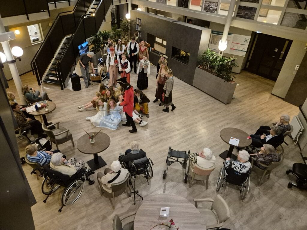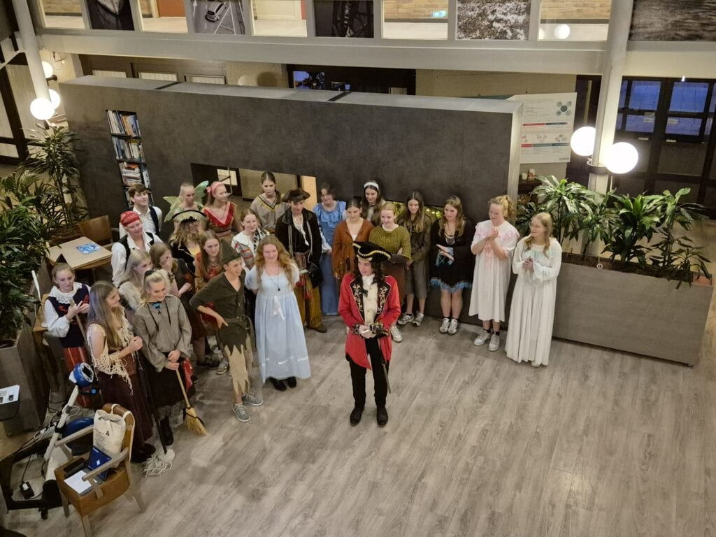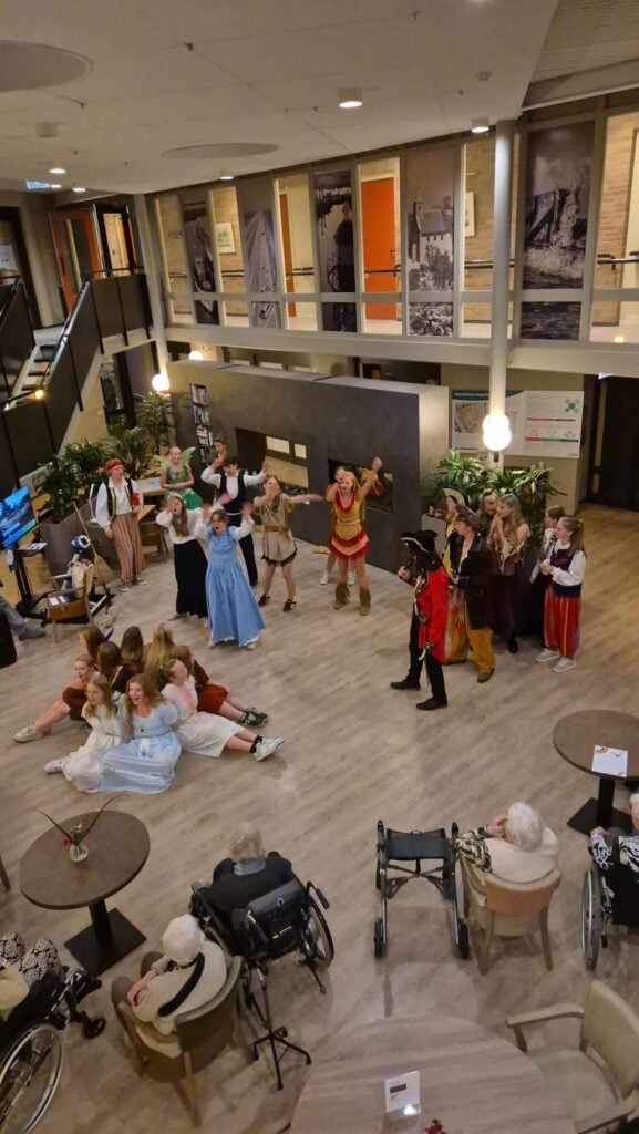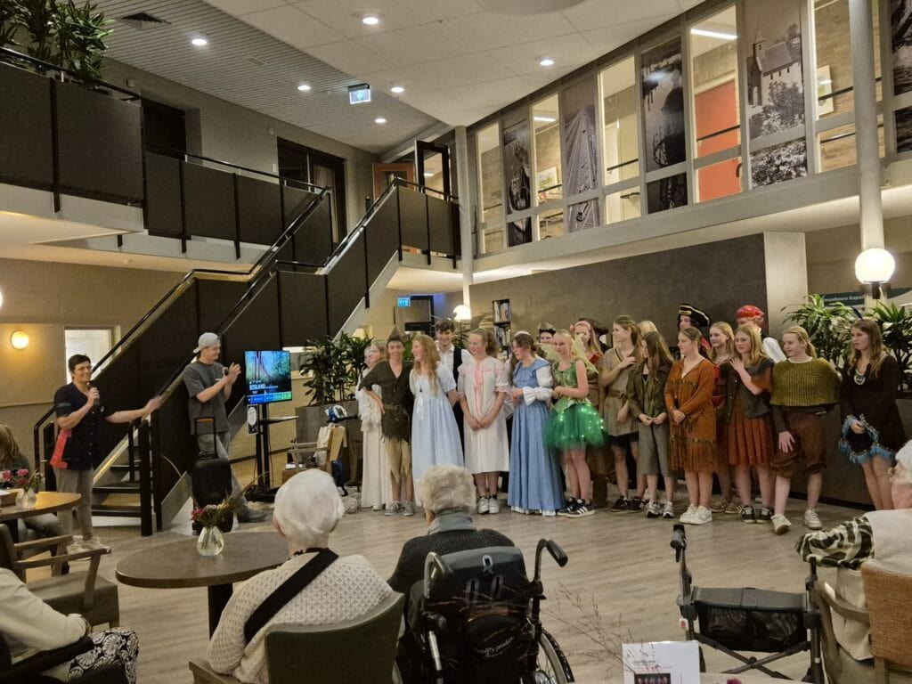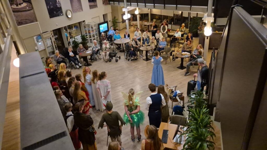 DEN OEVER – Op de beursvloer van de Hollands Kroonse Uitdaging maakte Thalia Muziektheater een match met Kapellehof. In ruil voor het uitprinten van scripts voor Thalia kwamen de Thalia Teens een stukje van de voorstelling Peter Pan aan de bewoners laten zien. Weer een mooie samenwerking met de dorpskern. De bewoners hebben erg genoten!