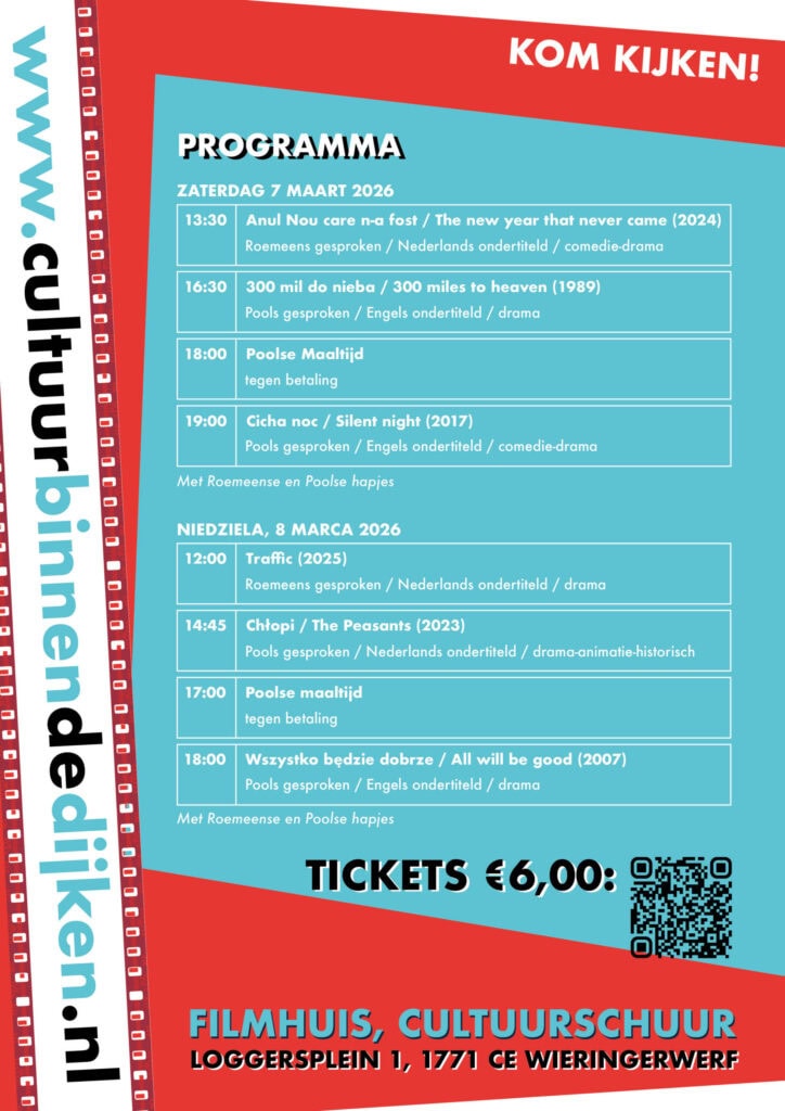WIERINGERWERF – Stichting Cultuur binnen de Dijken organiseert op zaterdag 7 en zondag 8 maart een Roemeens-Pools filmfestival (Ook voor Nederlanders!!). Het zal plaatsvinden in de filmzaal van De Cultuurschuur in Wieringerwerf.