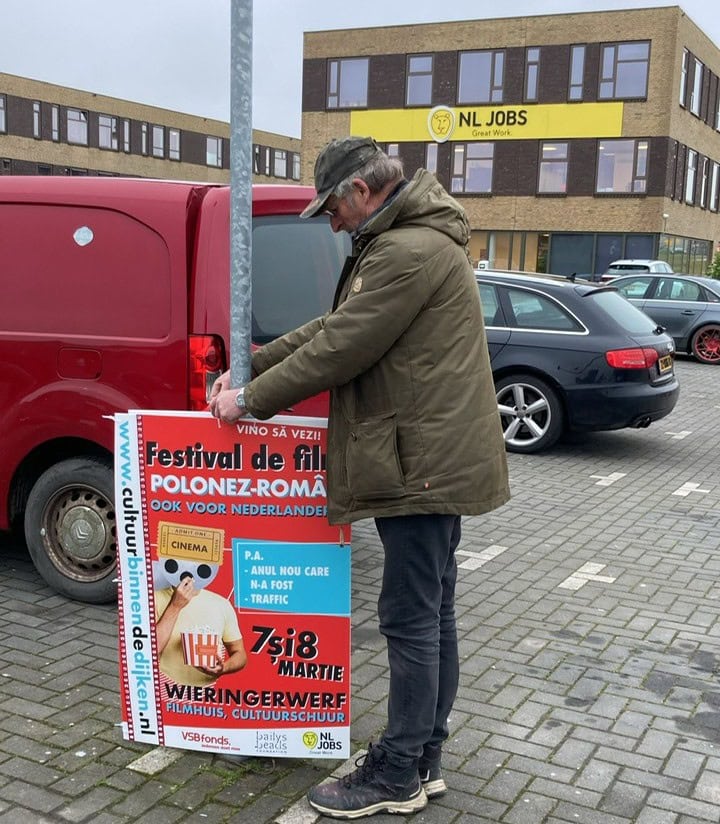 In de barre kou is de dappere vrijwilliger van Cultuur binnen de Dijken hard aan het werk om lantaarnpaalborden te plaatsen. Voor meer info en tickets: cultuurbinnendedijken.nl
